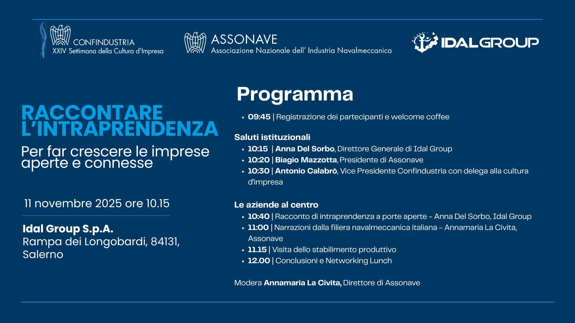 Nell'ambito della XXIV Settimana della Cultura d’Impresa promossa da Confindustria, Assonave - in collaborazione con IDAL Group - organizza l'incontro dal titolo " Raccontare l''intraprendenza", in programma l'11 novembre p.v. alle ore 10.15 presso la sede della IDAL Group.