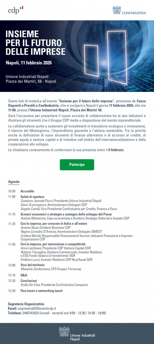 L’11 febbraio p.v., presso l'Unione Industriali Napoli, si terrà l’evento “Insieme per il futuro delle imprese”, promosso da Cassa Depositi e Prestiti e Confindustria.