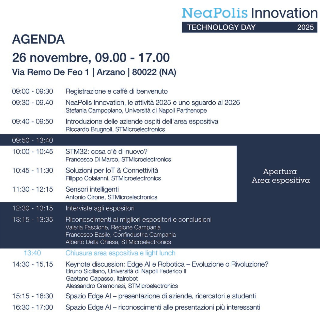 Il prossimo 26 novembre p.v., presso la STMicroelectronics, si terrà la quattordicesima edizione del NeaPolis Innovation Technology Day, l’appuntamento annuale che NeaPolis Innovation dedica a favorire l’incontro tra imprese, start-up, studenti e docenti universitari.